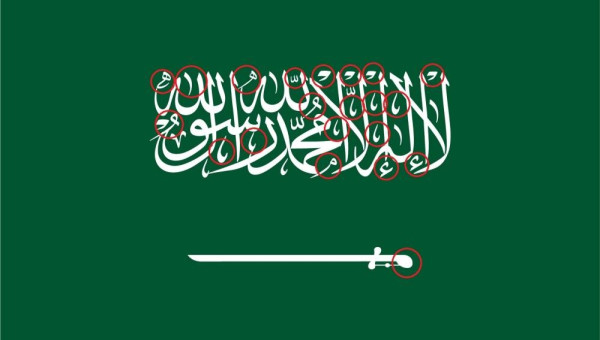 ويحمل علم السعودية الذي يتميز باللون الأخضر كلمة التوحيد الإسلامية (لا إله إلا الله محمد رسول الله)، والسيف العربي الذي يرمز للوطنية، ويحظر تنكسيه لحمل تلك العبارات الدينية المقدسة.